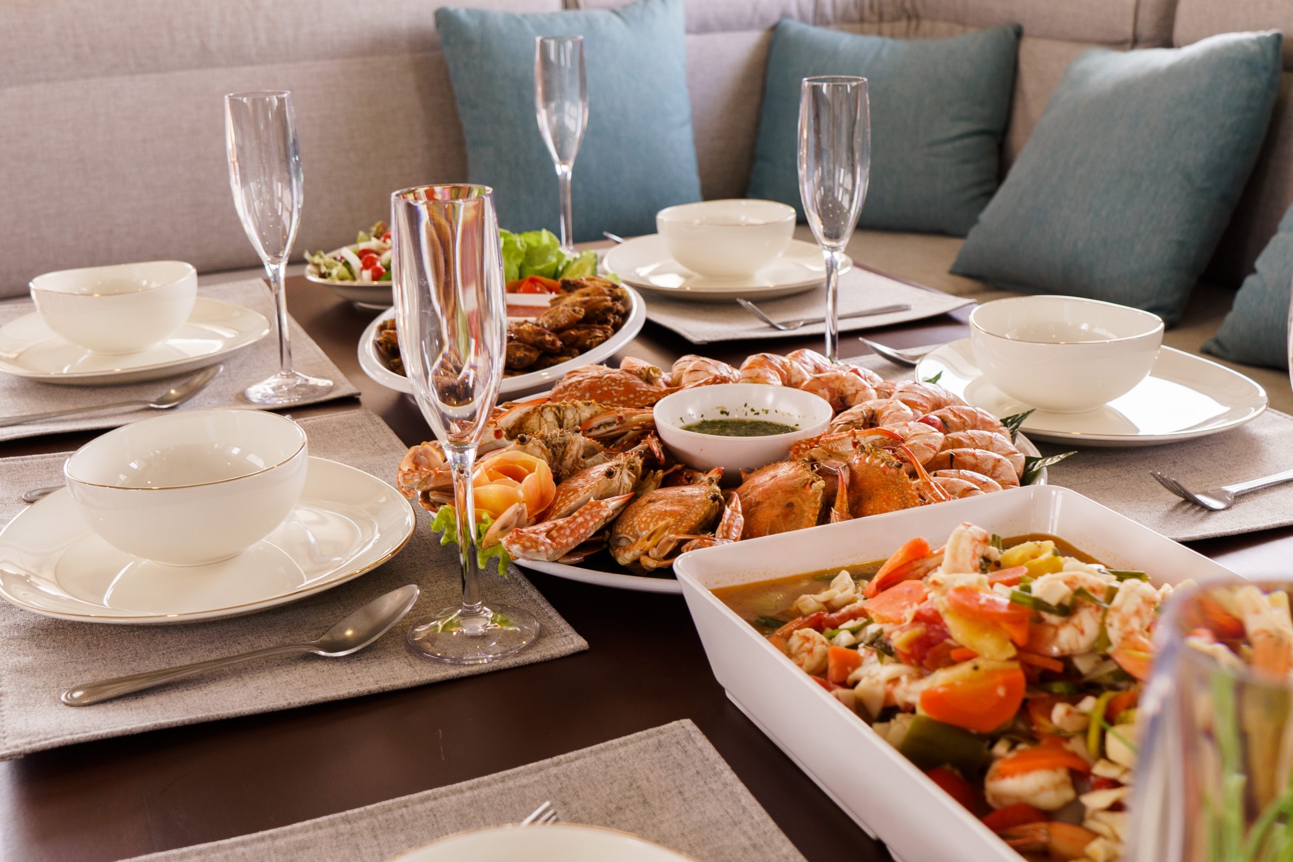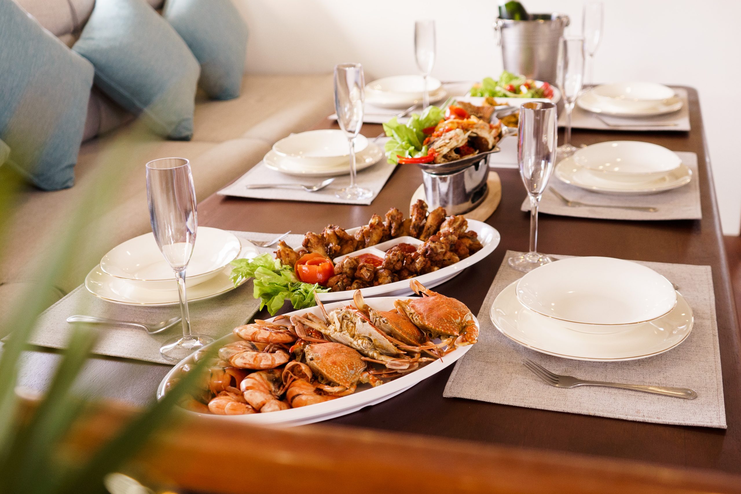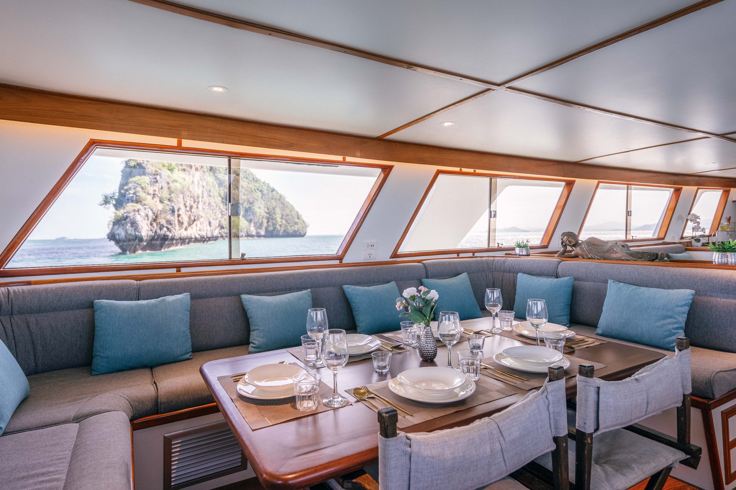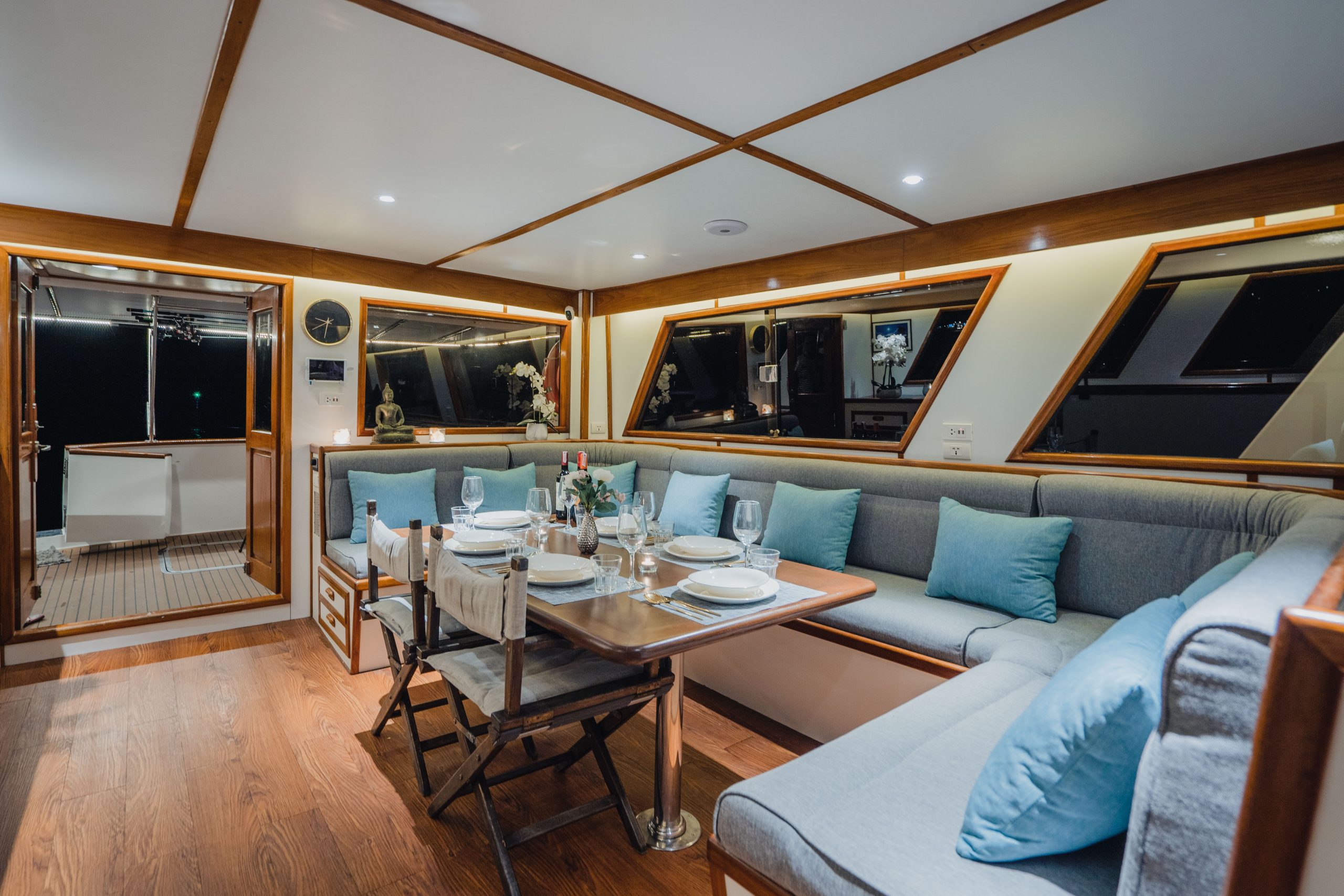 Our yacht offers a vast living space, with four cabins, comfortably accommodating up to 12 guests. Cruise to your dream destinations where you can customise your journey at every turn, from exploring remote islands and diving in the sparkling waters of Thailand, to exclusive dining onboard and sunset yoga on white sandy beaches.